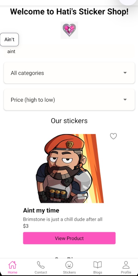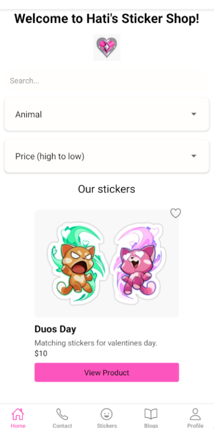 In our second year, once again, we learned about mobile development, and more specifically React Native. We had to create some kind of shop. I chose to make one about stickers.